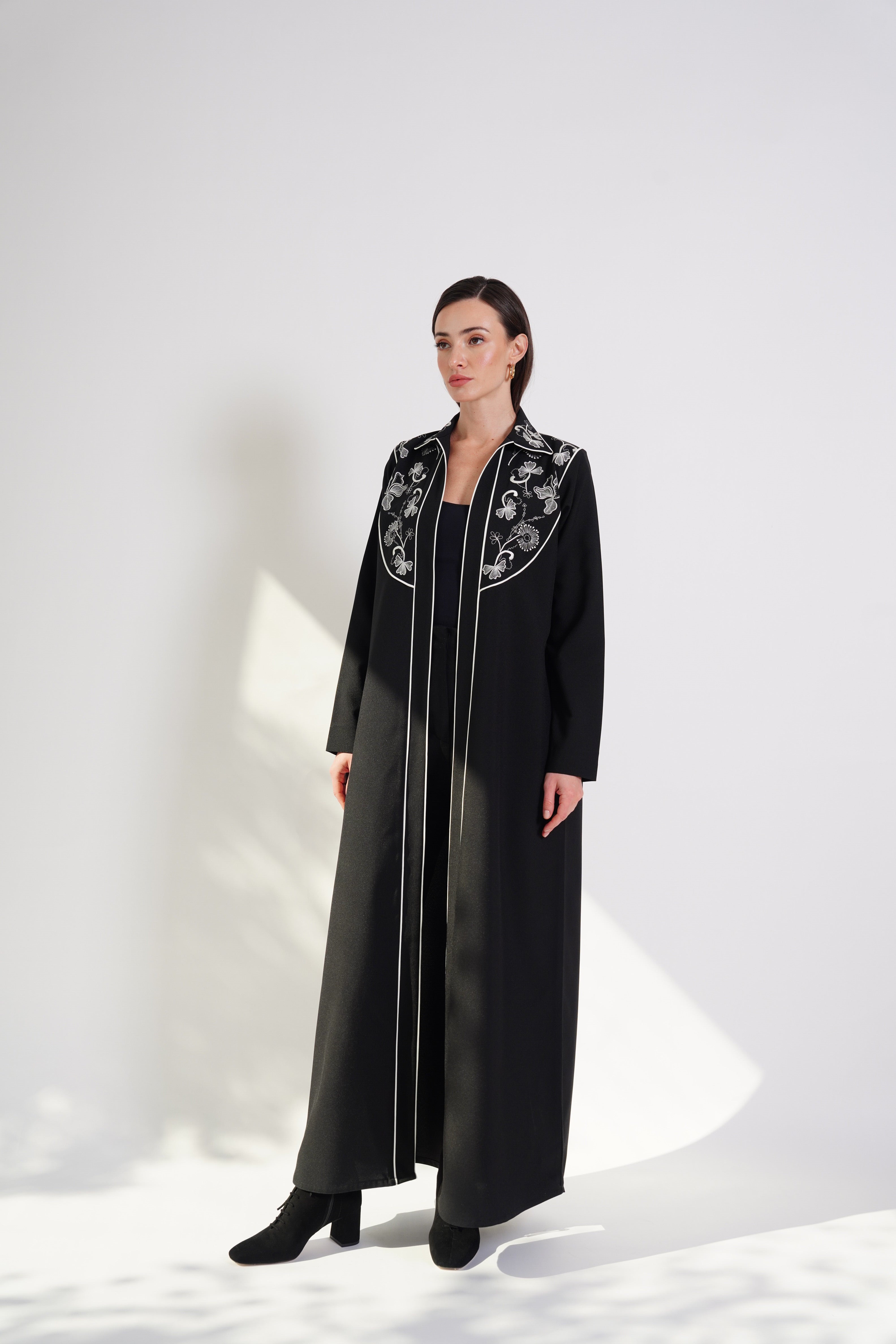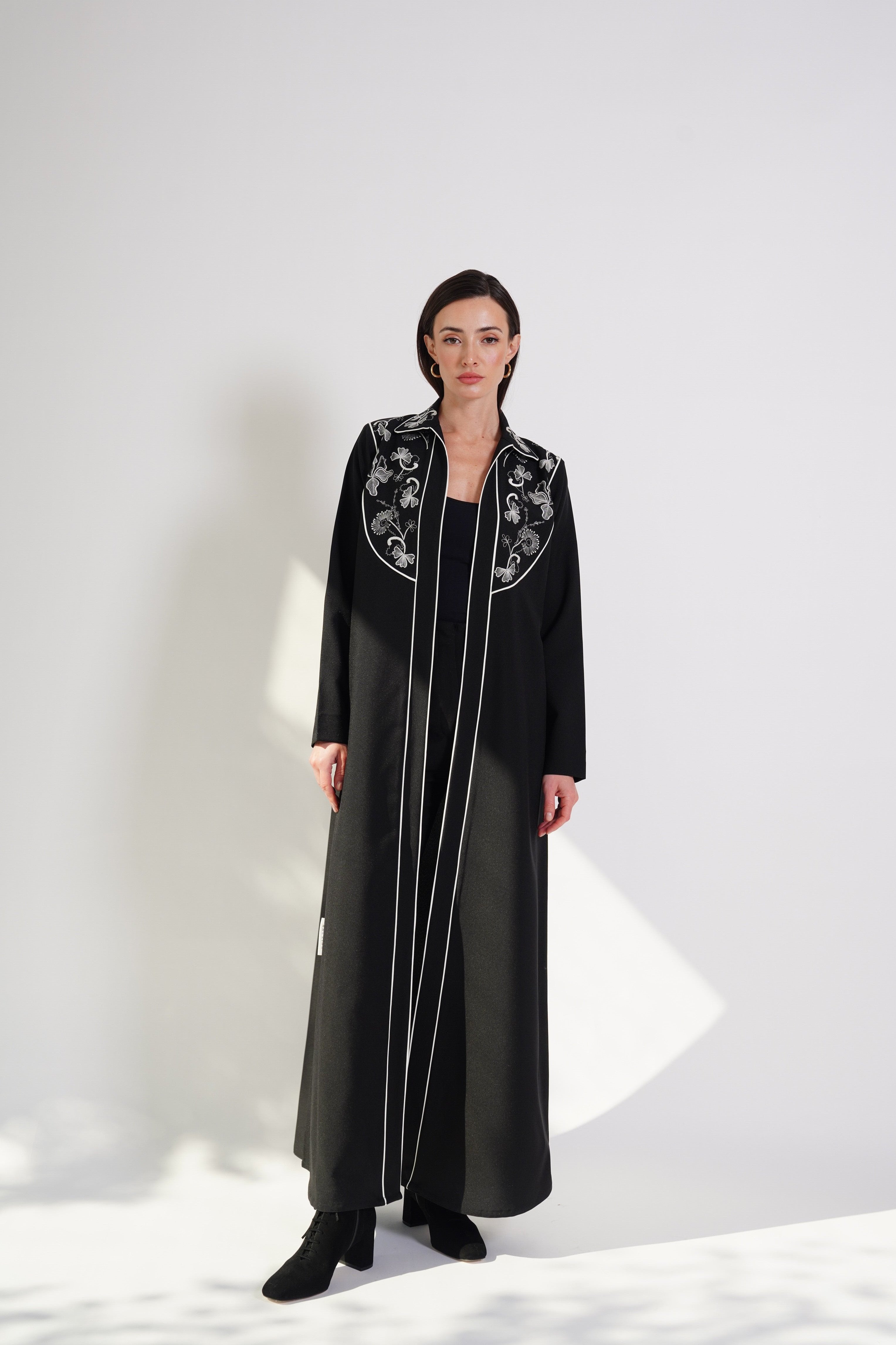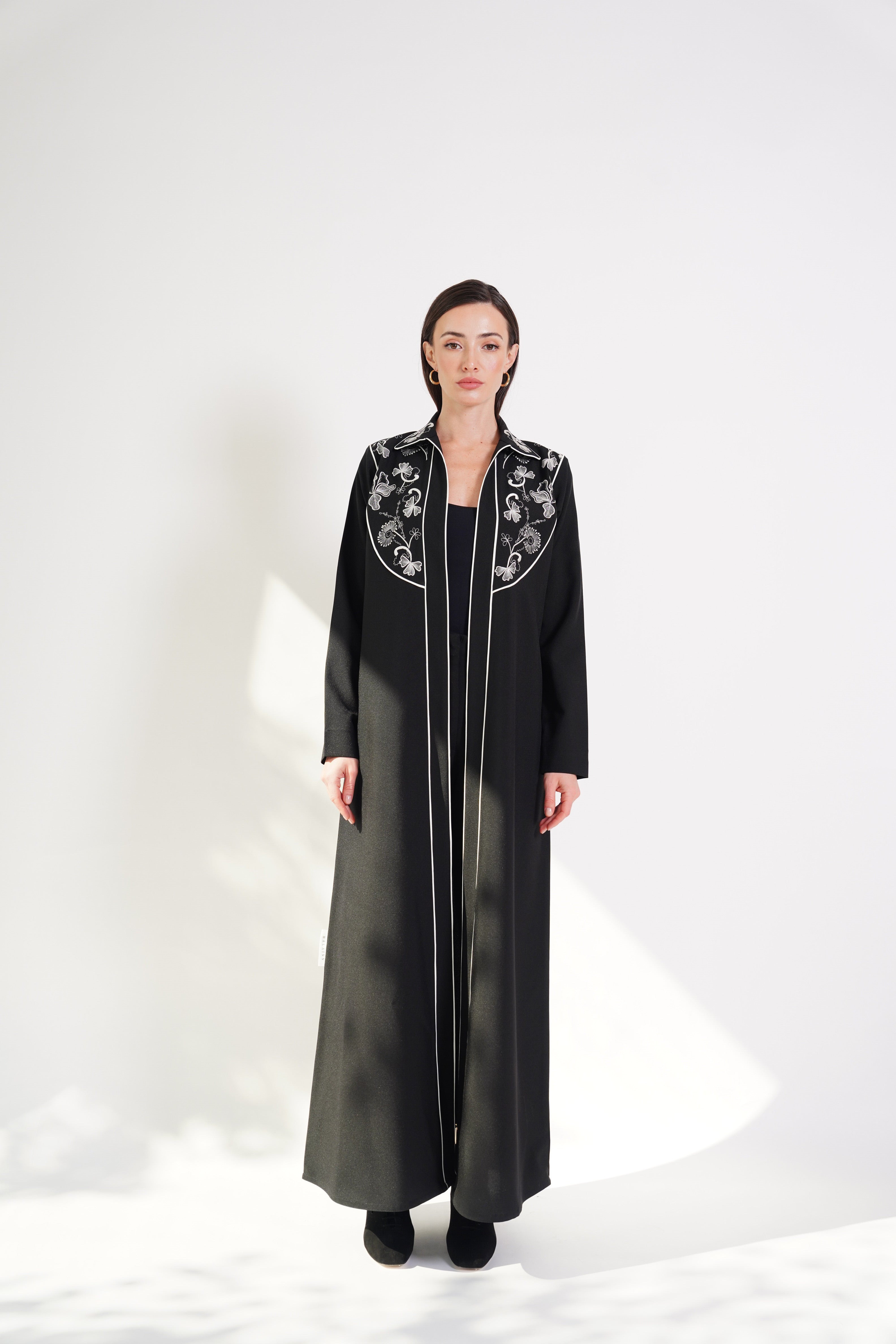 The White Threads abaya features intricate white embroidery gracefully adorning the chest and upper shoulders. Its refined black fabric and delicate detailing exude timeless elegance. Perfect for formal occasions or an effortlessly sophisticated look.