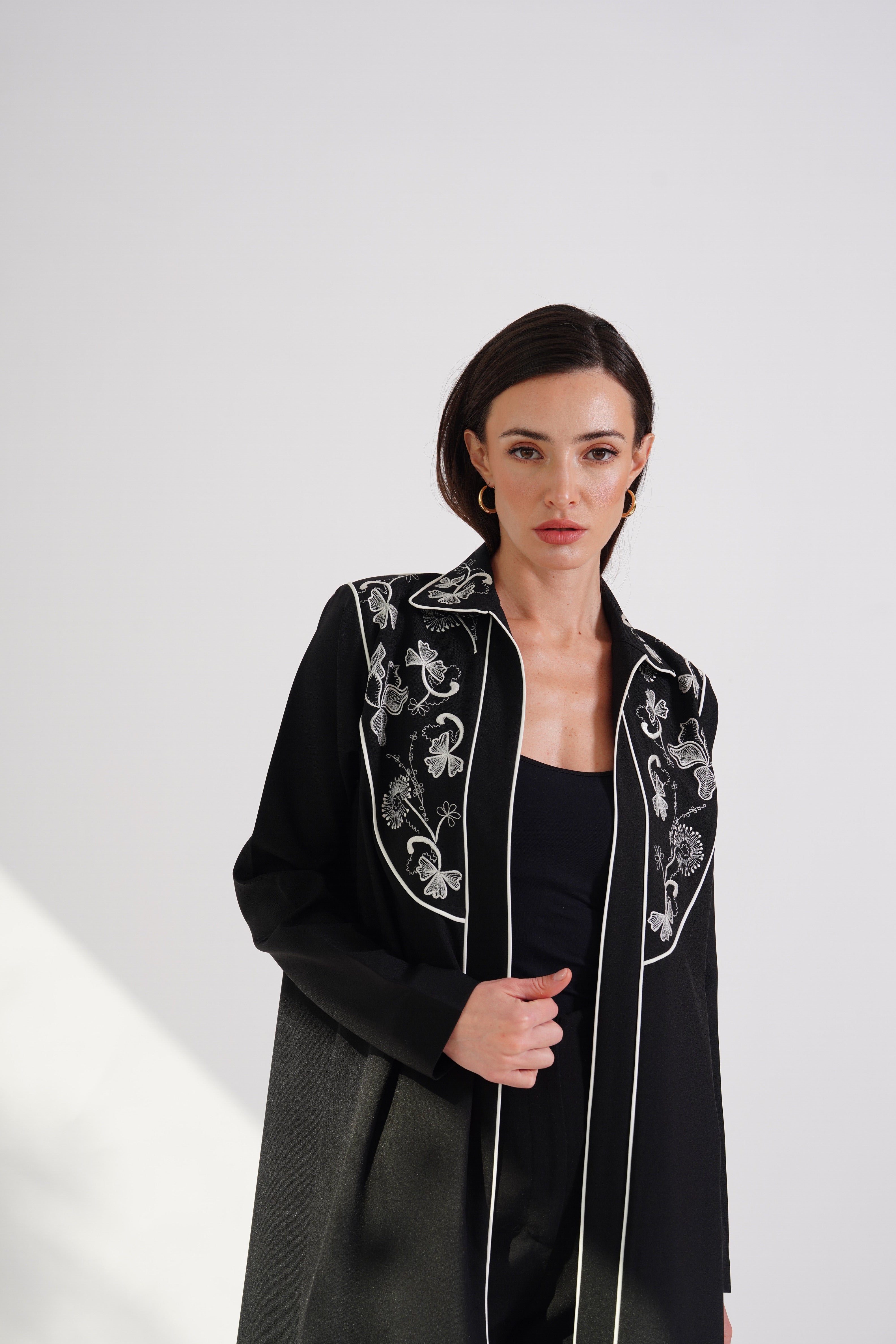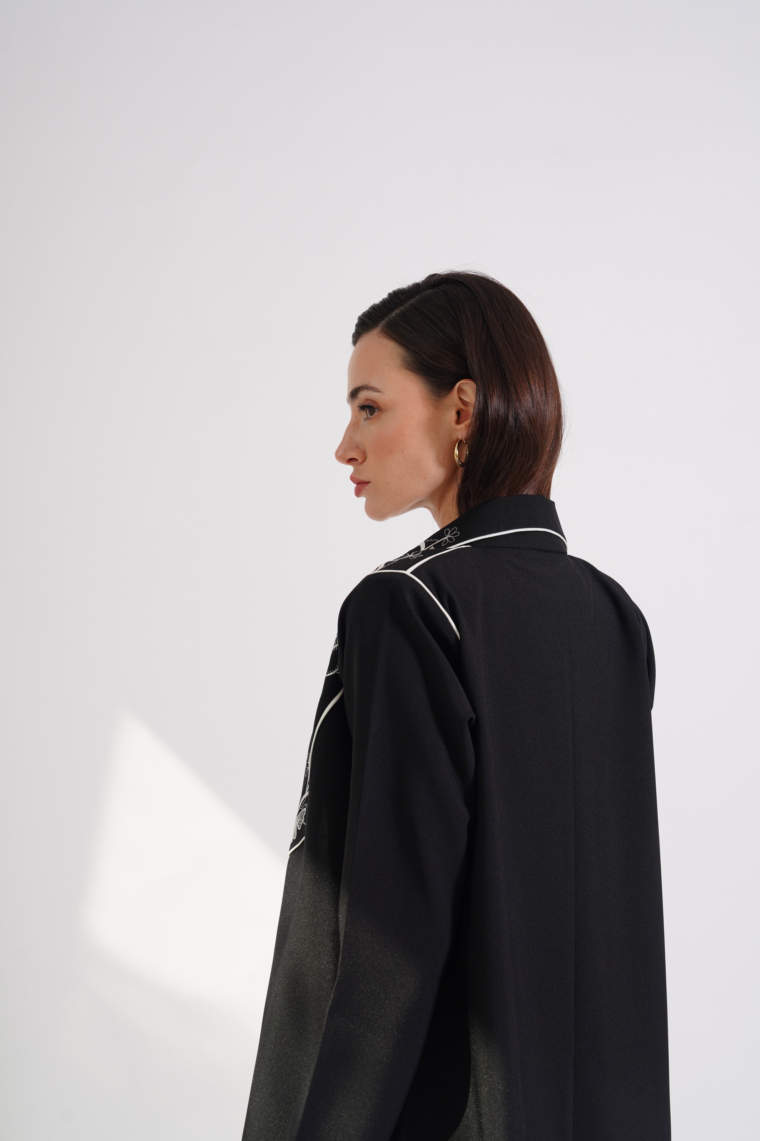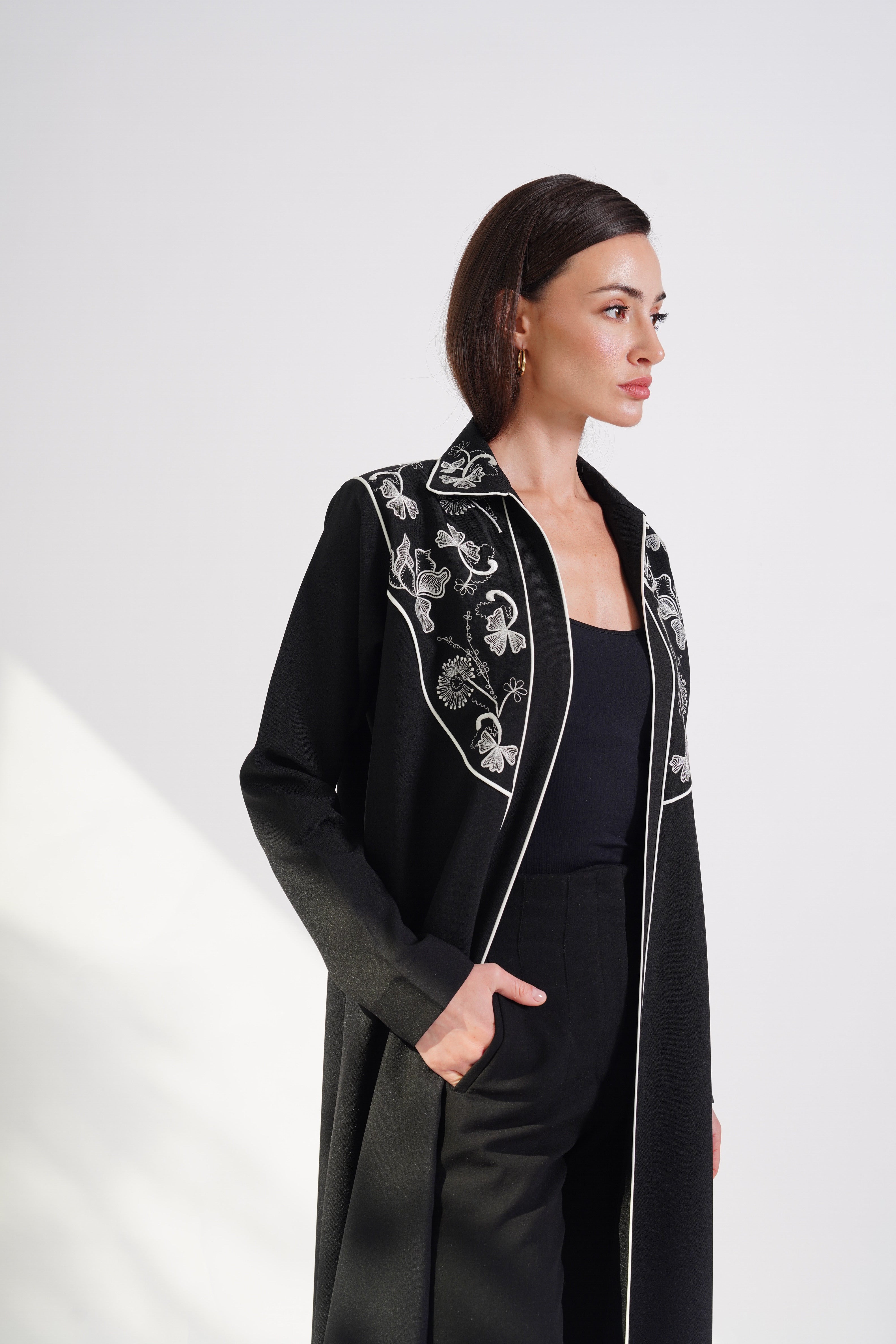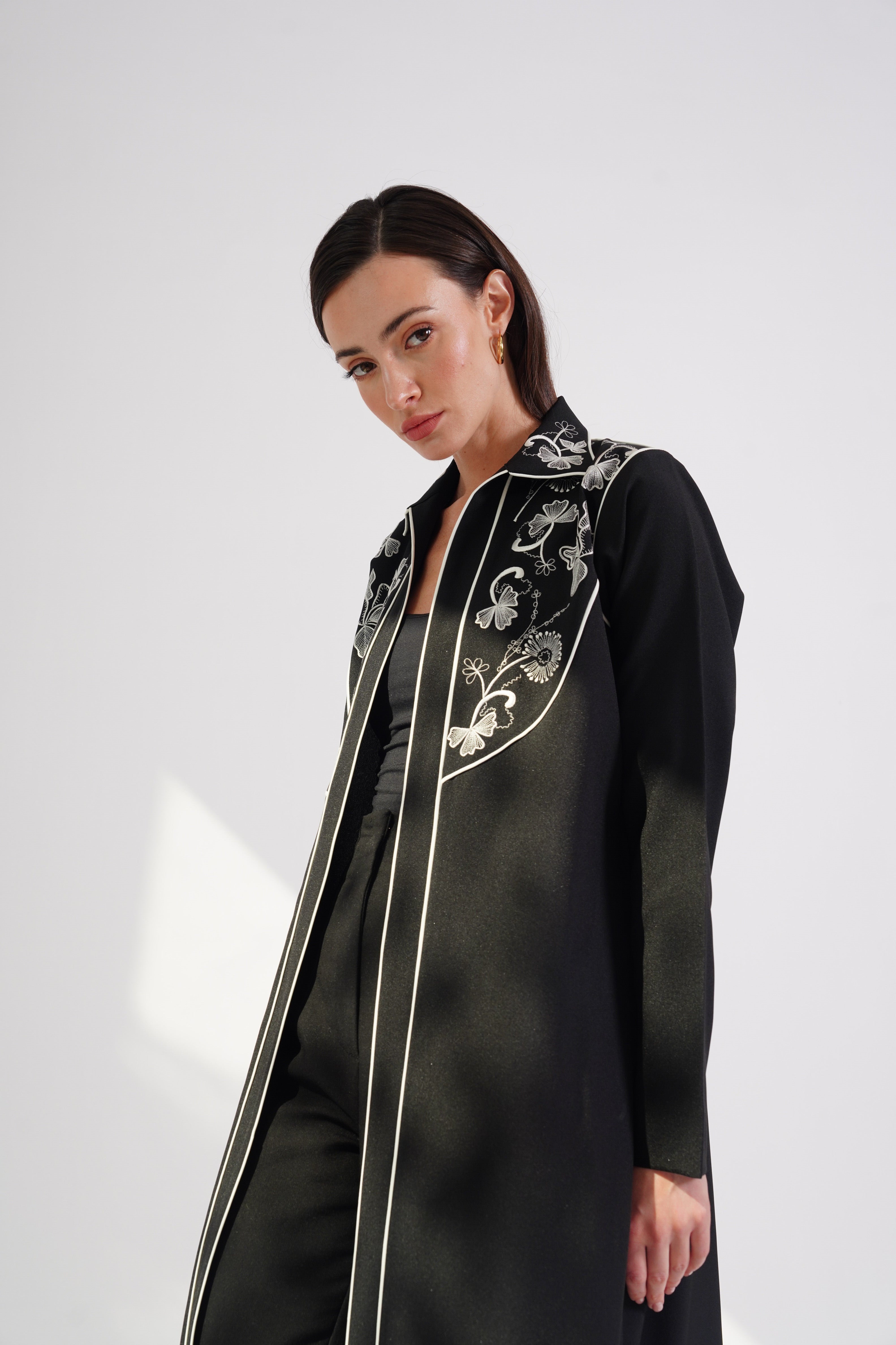 The White Threads abaya features intricate white embroidery gracefully adorning the chest and upper shoulders. Its refined black fabric and delicate detailing exude timeless elegance. Perfect for formal occasions or an effortlessly sophisticated look.